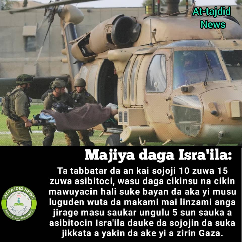 Majiya daga Isra’ila:Ta tabbatar da an kai sojoji 10 zuwa 15 zuwa asibitoci, wasu daga cikinsu na cikin mawuyacin hali suke bayan da aka yi musu luguden wuta da makami mai linzami anga jirage masu saukar ungulu 5 sun sauka a asibitocin Isra’ila dauke da sojojin da suka jikkata a yakin da ake yi a zirin Gaza.