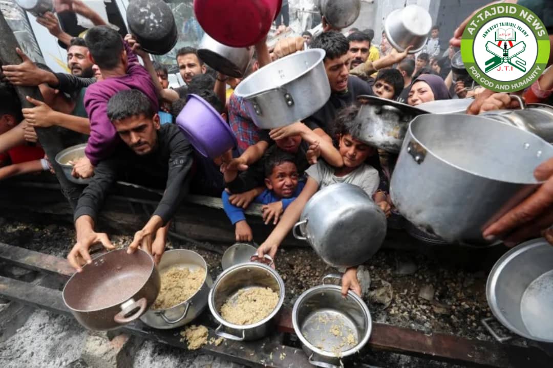 Palestinians wait to receive food cooked by a charity kitchen, in Jabalia, in the northern Gaza Strip, on May 14, 2025 [File: Mahmoud Issa/Reuters]